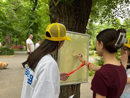 На одной из станций в формате игры было представлено, как зависимость мешает идти к цели: человек рисовал круг, а волонтеры тянули за ленточки, привязанные к его руке. Было смешно и очень наглядно.